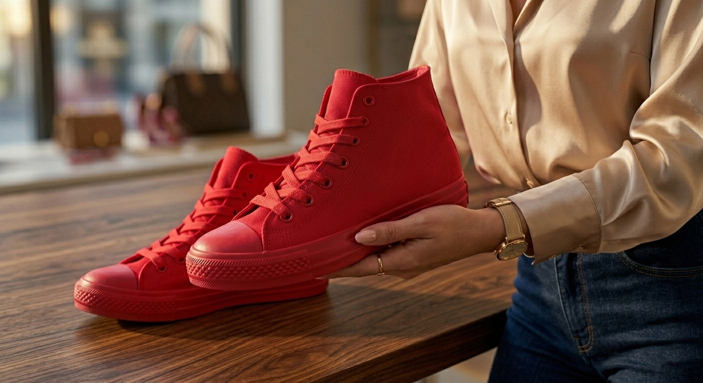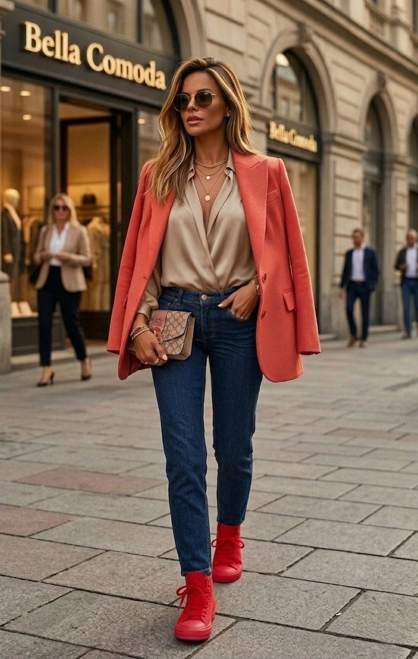 Biel działa jak czyste płótno – pozwala czerwieni trampków "wybrzmieć" z pełną siłą. Takie połączenie kojarzy się z wakacjami, energią i luksusowym stylem marynistycznym, ale w nowoczesnym, miejskim wydaniu. Jest to zestaw, który odmładza i dodaje sylwetce dynamizmu!