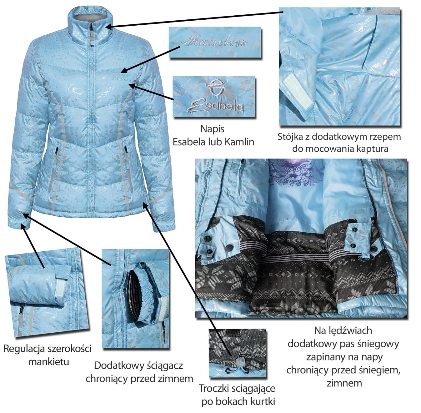 Kurtka od środka na wysokości lędźwi ma dodatkowy pas antyśniegowy zapinany na napy