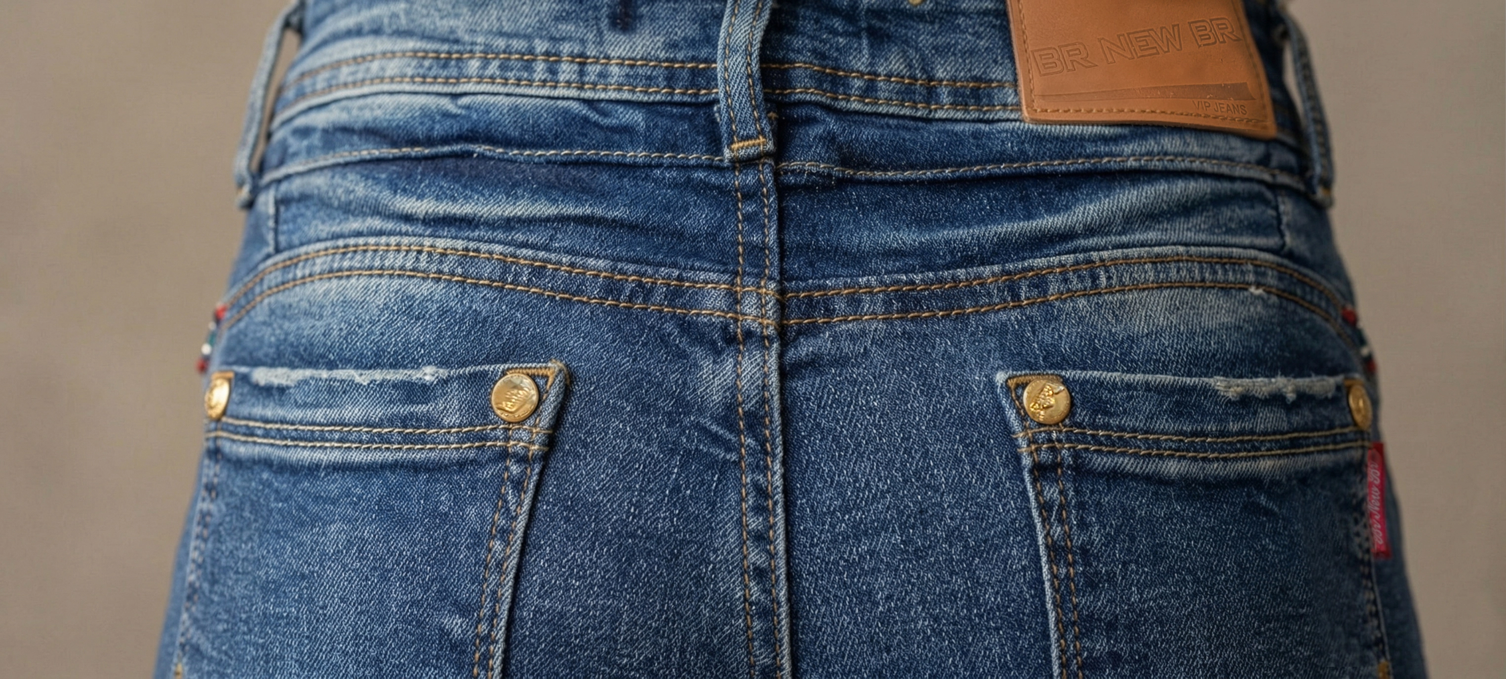 Jasne Przeszycia: Całość została wykończona kontrastową, jaśniejszą nitką, która podkreśla linię szwów i detale przy kieszeniach, nadając jeansom profesjonalnego, starannego wyglądu.
