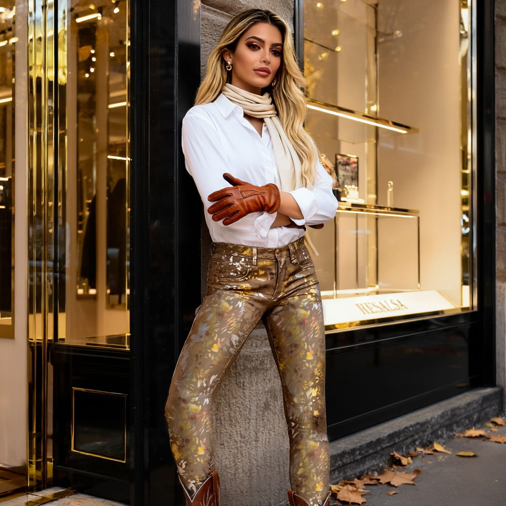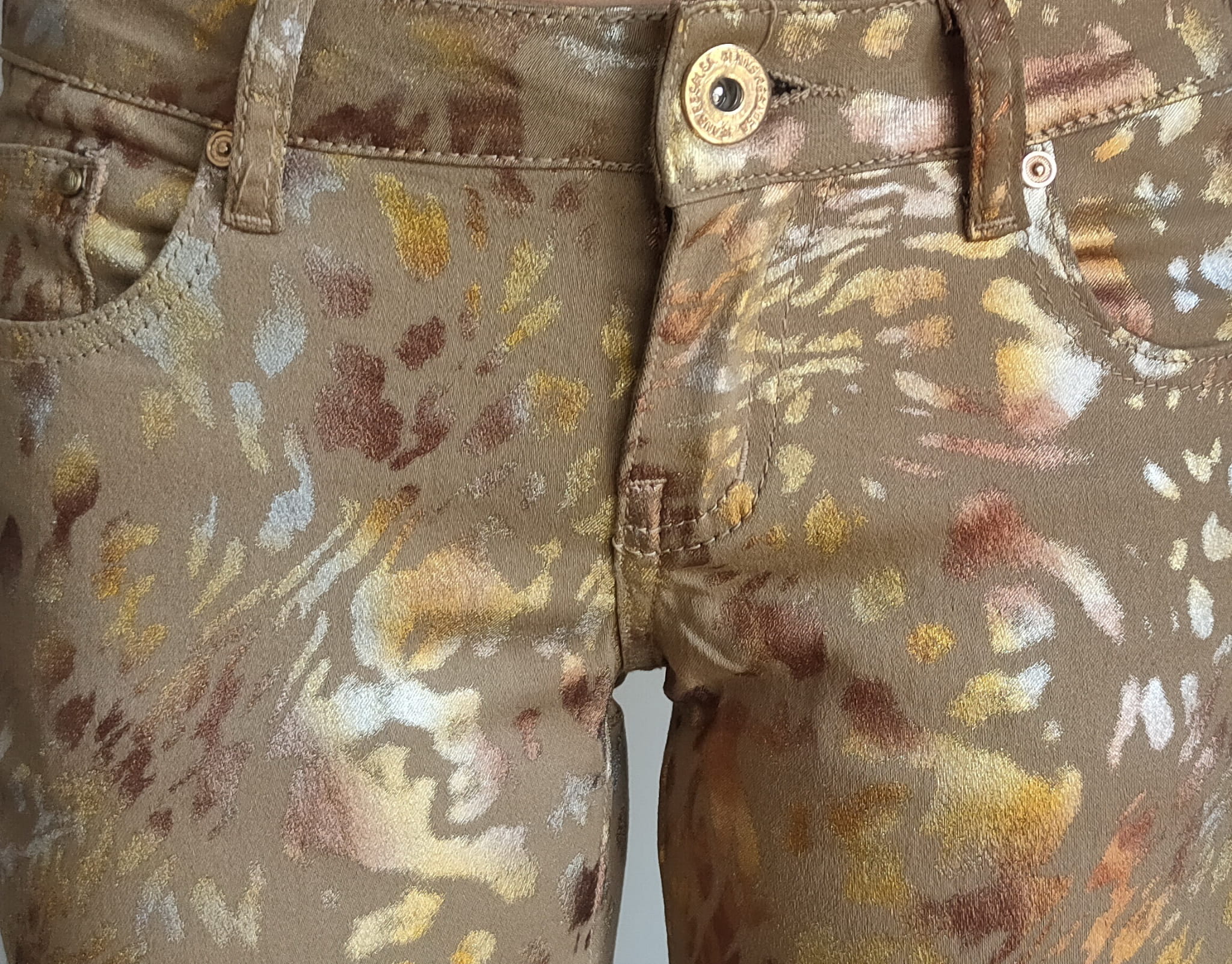 Zabłyśnij i zdefiniuj swój styl na nowo z naszymi zjawiskowymi spodniami, które są kwintesencją glamour. To propozycja dla odważnych kobiet, które kochają być w centrum uwagi i nie boją się modowych eksperymentów. Bazowy kolor beżu został pokryty spektakularnym, metalicznym printem w odcieniach złota, srebra i miedzi, tworząc niepowtarzalny efekt.