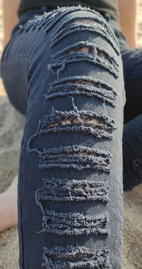 Te ciemnogranatowe spodnie z efektownymi nacięciami i subtelną koronką to absolutny must-have dla fanek stylu dark denim i grunge.