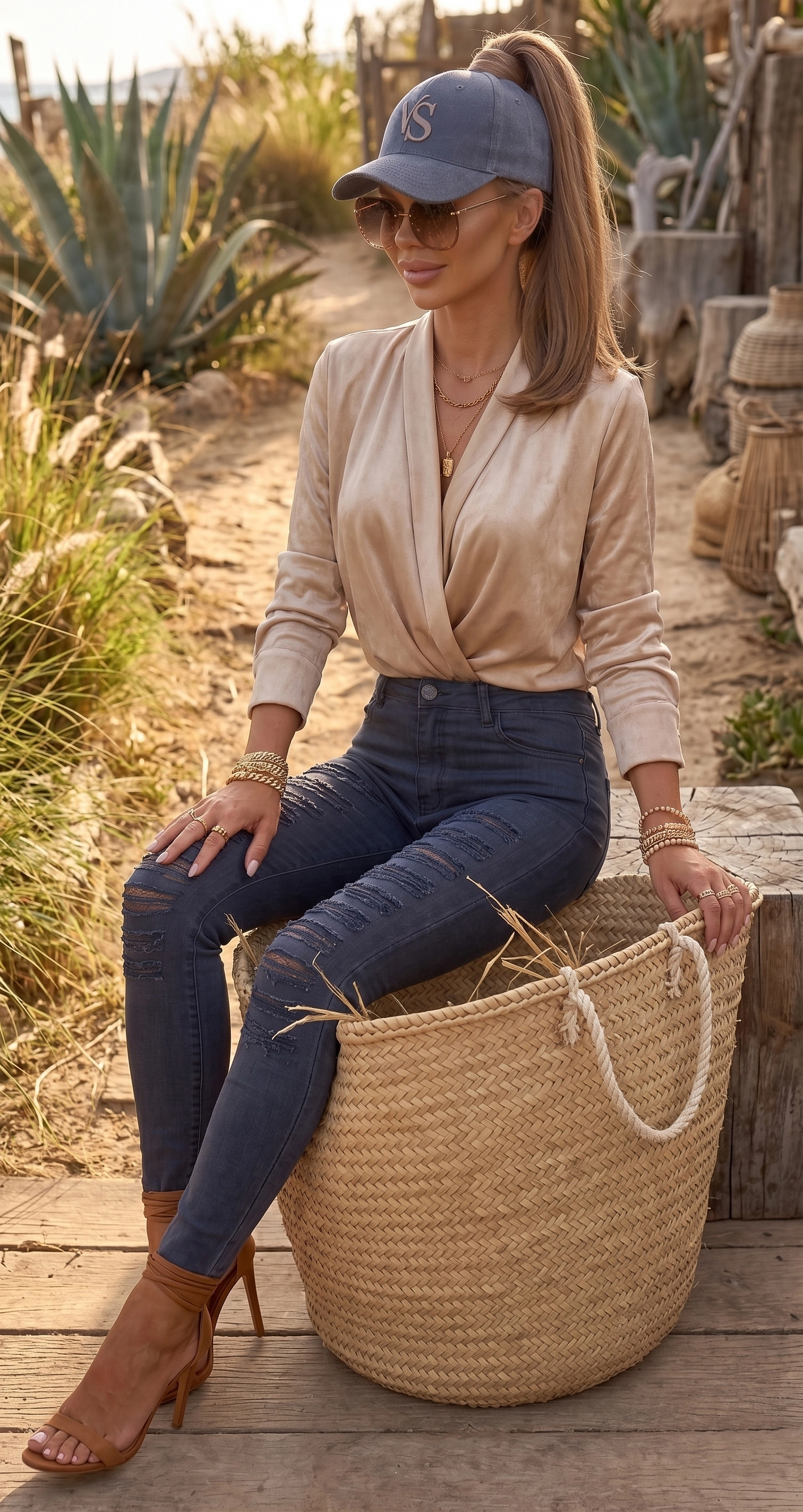 Połączenie głębokiego koloru navy, surowych przetarć i delikatnego ażuru sprawia, że ten model przyciąga wzrok i nadaje sylwetce nowoczesnego charakteru.